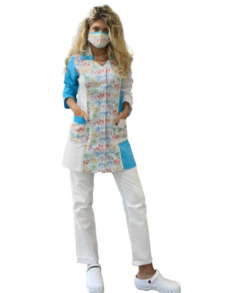 CASACCA MANICA LUNGA, CON COLLETTO A CAMICIA E SCOLLO A V, ABBOTTONATURA NASCOSTA CON CLIPS. MANICHE REGOLABILI, DUE TASCHE ANTERIORI.