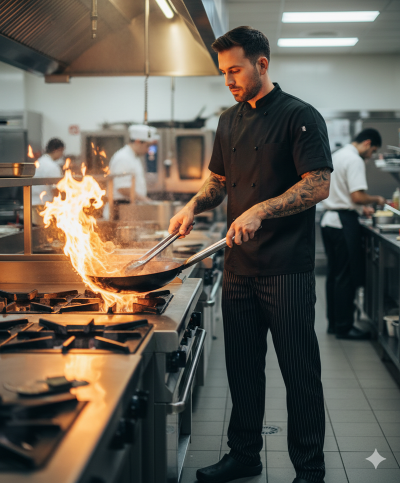 GIACCA CUOCO NERA MANICA CORTA, LINEA CLASSICA MODELLO EXCELSIOR CON COLLO ALLA COREANA, TASCHINO SULLA MANICA SINISTRA CON LOGO "GOELDLIN CHEF", BOTTONI DI SICUREZZA ESTRAIBILI ANTIPANICO E TESSUTO MICROFIBRA TRASPIRANTE POSTERIORE. GIACCA INDICATA PER CUOCHI, PIZZAIOLI E PER CHI HA LA PASSIONE IN CUCINA. TESSUTO CONFORTEVOLE E TRASPIRANTE 100% COTONE. LAVAGGIO FINO A 40°. MADE IN ITALY. TAGLIE DA XS A 5XL.