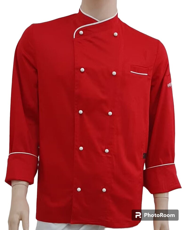 GIACCA CUOCO ROSSA CON PROFILO E BOTTONI BIANCO, LINEA CLASSICA MODELLO EXCELSIOR CON COLLO TRASVERSALE, TASCHINO SULLA MANICA SINISTRA CON LOGO "GOELDLIN CHEF" E BOTTONI DI SICUREZZA ESTRAIBILI ANTIPANICO. MANICHE AVVOLGIBILI. GIACCA INDICATA PER CUOCHI, PIZZAIOLI E PER CHI HA LA PASSIONE IN CUCINA. TESSUTO CONFORTEVOLE E ROBUSTO 100% COTONE. LAVAGGIO FINO A 40°. MADE IN ITALY. TAGLIE DA S A 5XL.