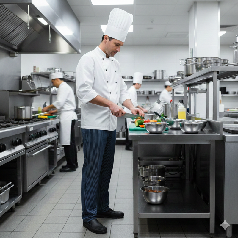 PANTALACCIO CUOCO UNISEX MARCA " GOELDLIN CHEF" REGOLABILE IN VITA CON COULISSE. COMODO E PRATICO GRAZIE ALL'ELASTICO ED IL LACCIO IN VITA, DUE TASCHE SUL DAVANTI ED UNA POSTERIORE.