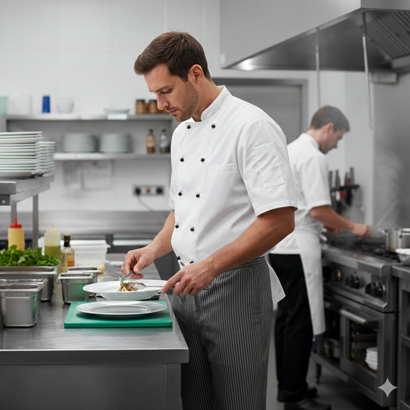 PANTALACCIO CUOCO UNISEX MARCA " GOELDLIN CHEF" REGOLABILE IN VITA CON COULISSE. COMODO E PRATICO GRAZIE ALL'ELASTICO ED IL LACCIO IN VITA, DUE TASCHE SUL DAVANTI ED UNA POSTERIORE.