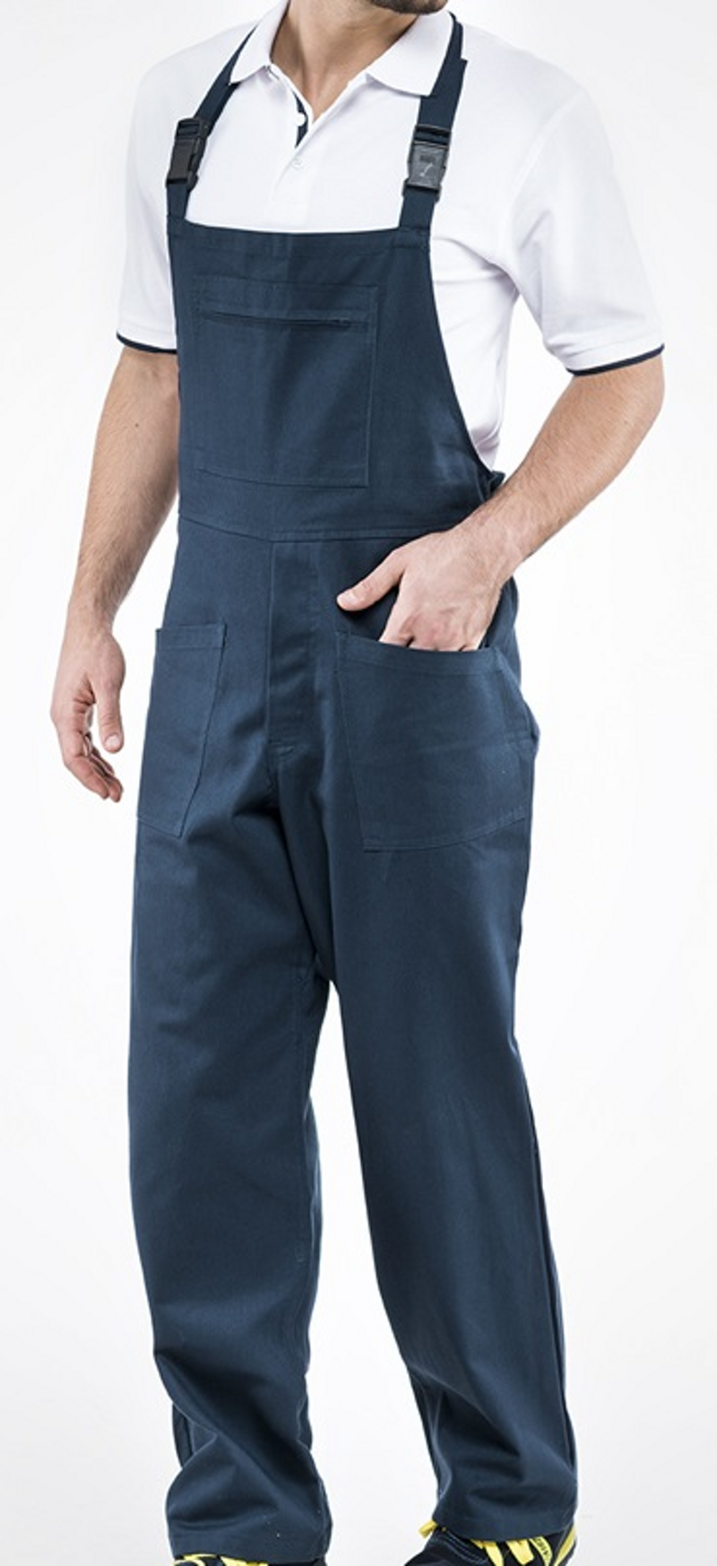 SALOPETTE DA LAVORO IN 100% COTONE, CHIUSURA CON BOTTONI RICOPERTI CON PATTINA, GANCI IN PLASTICA, ELASTICO E BOTTONE IN VITA, TASCA CON CERNIERA SUL PETTO, 2 TASCHE LATERALI, TASCA PORTAMETRO GAMBA DESTRA, TASCA POSTERIORE CHIUSA CON BOTTONE TAGLIA DA XS A 4XL COLORE: BLU
