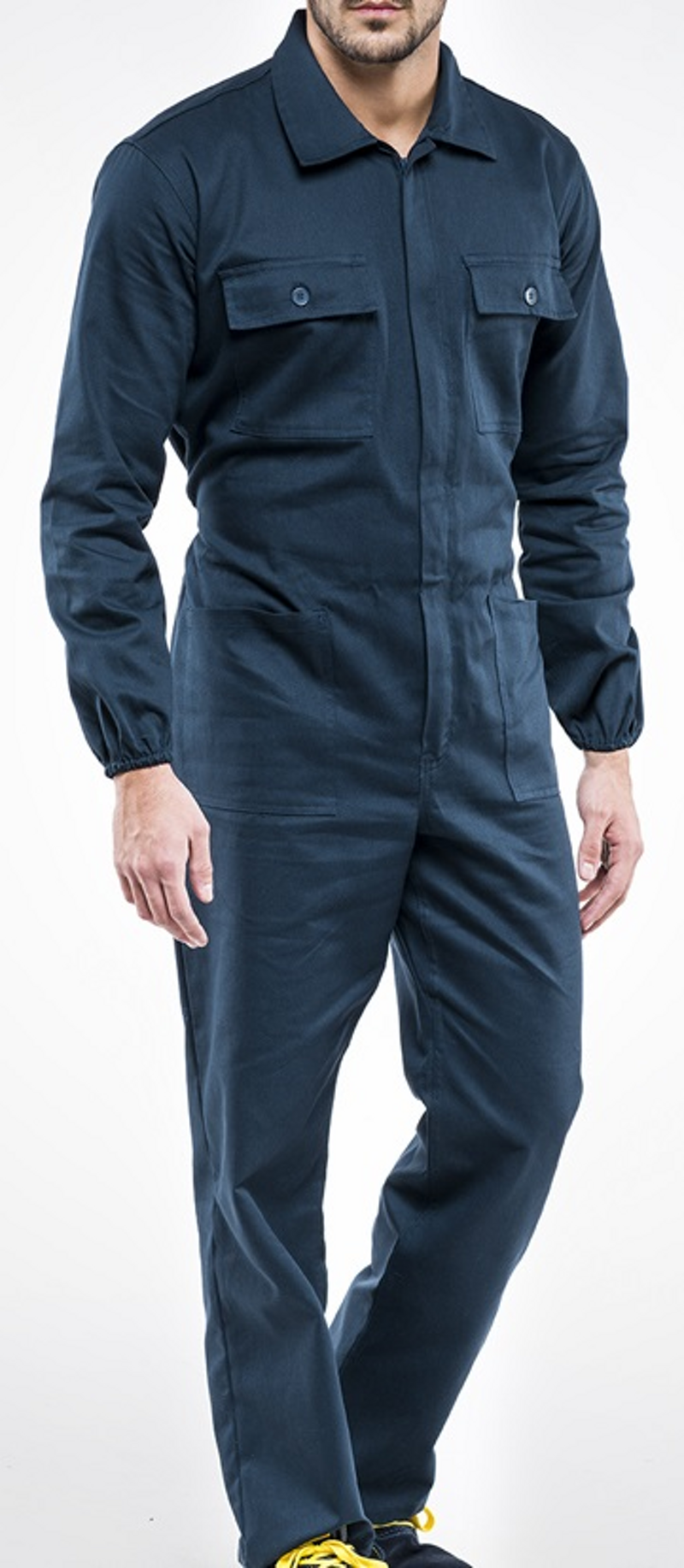 TUTA DA LAVORO IN 100% COTONE, CHIUSURA CON CERNIERA IN PLASTICA, ELASTICO IN VITA E AI POLSI, 2 TASCHE SUL PETTOCON BOTTONE E PATTINA, 2 TASCHE LATERALI, TASCA PORTAMETRO GAMBA DESTRA, TASCA POSTERIORE CHIUSA CON BOTTONE TAGLIE DA XS A 4XL COLORE: BLU